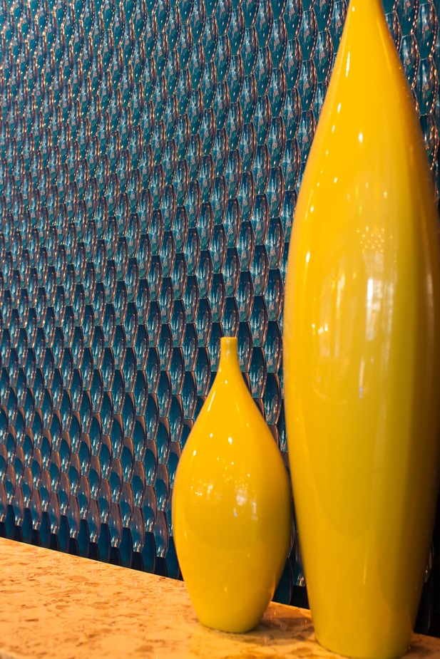 Accent feature wall in the Seattle Hilton lobby was transformed from a routed MDF panel into a high gloss, glass like finish. Our skilled technician sprayed this panel from eight different directions to successfully coat the various angles uniformly.